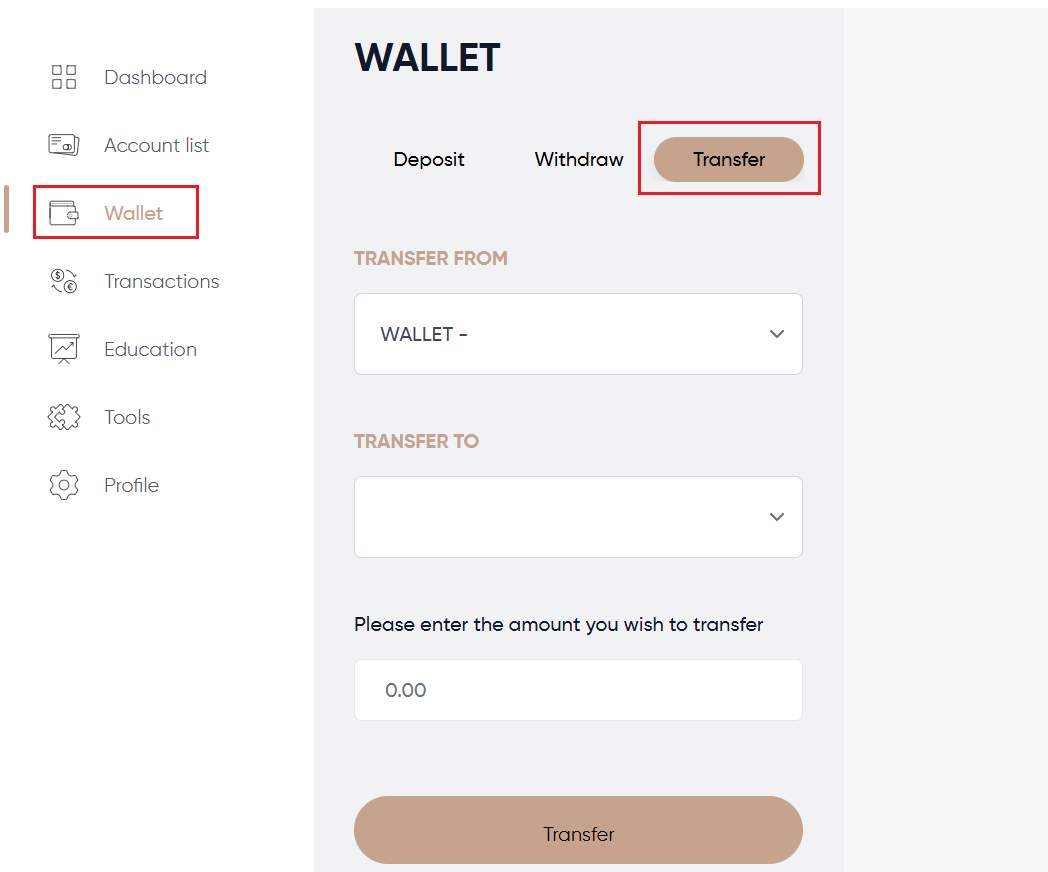 Um die Gelder in Ihrem Handelskonto sichtbar zu machen, müssen Sie eine interne Überweisung von Ihrem Wallet auf das Handelskonto (und umgekehrt) durchführen.
